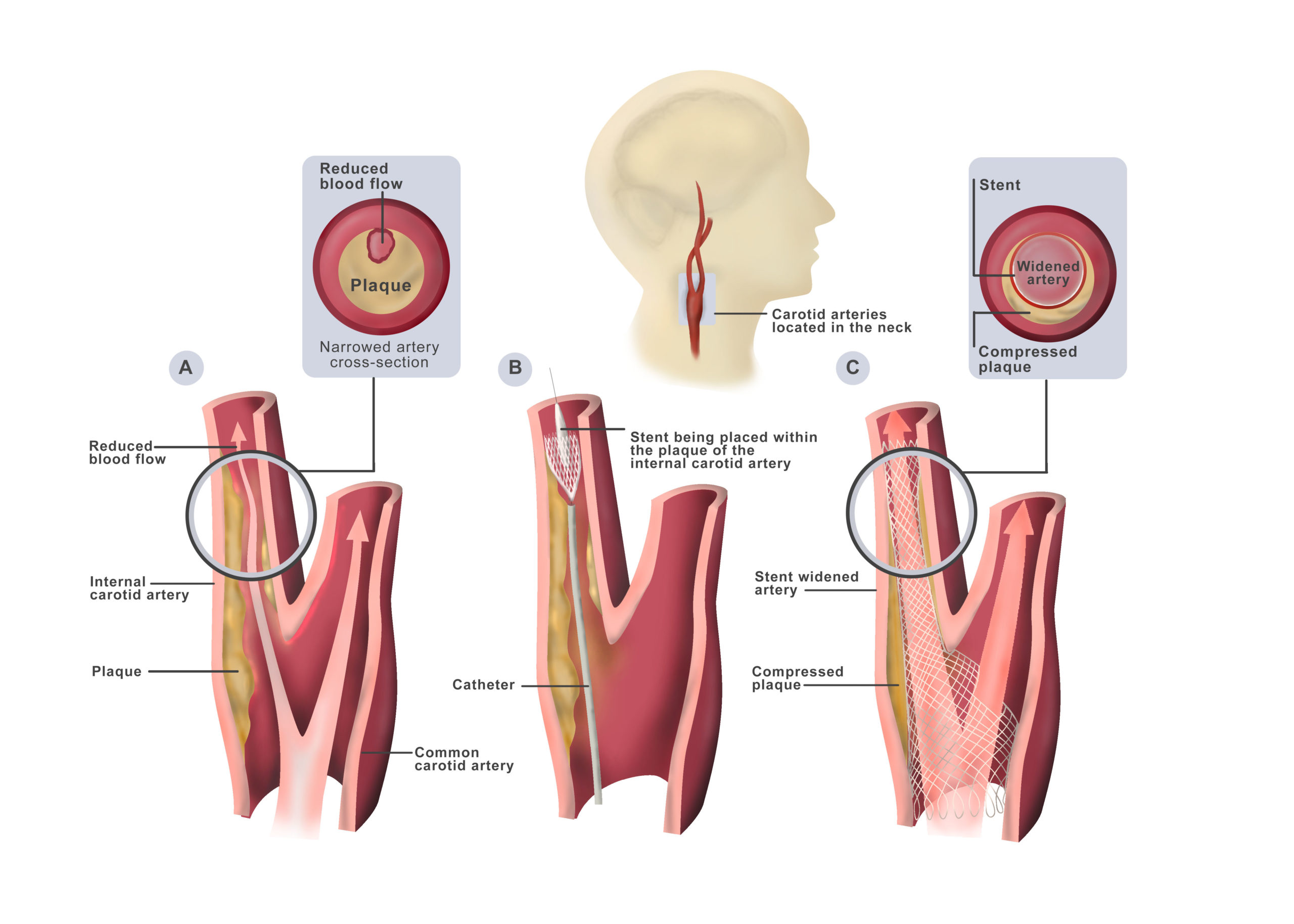 Carotid angioplasty / stenting is a minimally invasive endovascular procedure that compresses the plaque and widens the lumen of the artery. It is performed during an angiogram in a radiology suite. A flexible catheter is inserted in the femoral artery in the groin. It is guided through the blood stream past the heart, and into the carotid artery. Next, a small catheter with an inflatable balloon at the tip is positioned across the plaque. The balloon is opened to dilate the artery and compress the plaque against the artery wall. The balloon is then deflated and removed. Finally, a self-expanding mesh-like tube called a stent is placed over the plaque, holding open the artery.